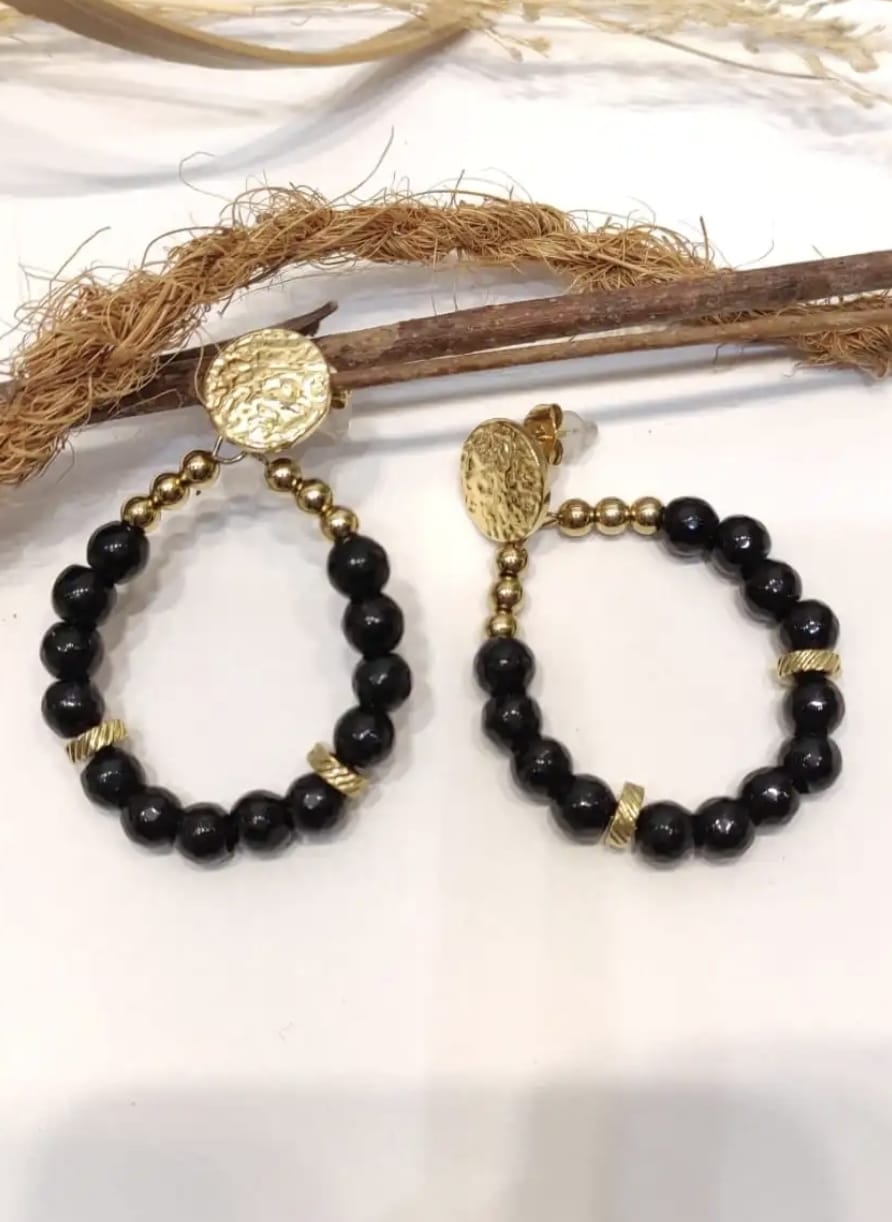 Boucle d'oreille Capucine en perles noires en acier inoxydable. Hauteur total 5 cm
