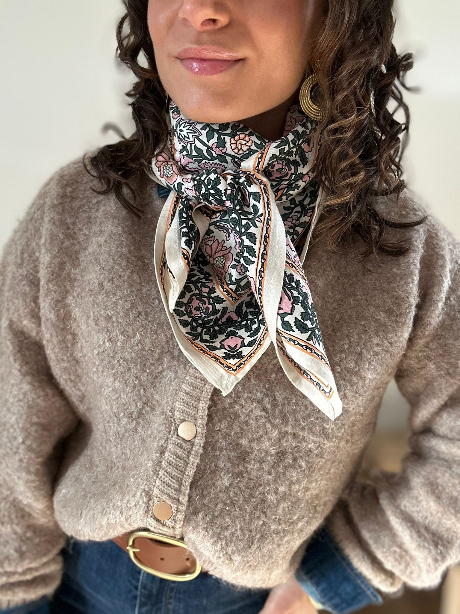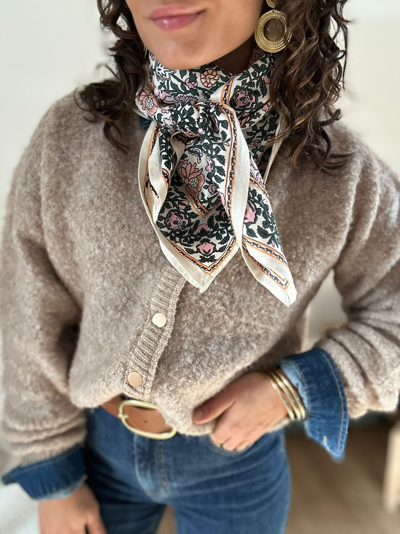 Foulard Laura fond blanc avec tonalité de vert foncé et de rose