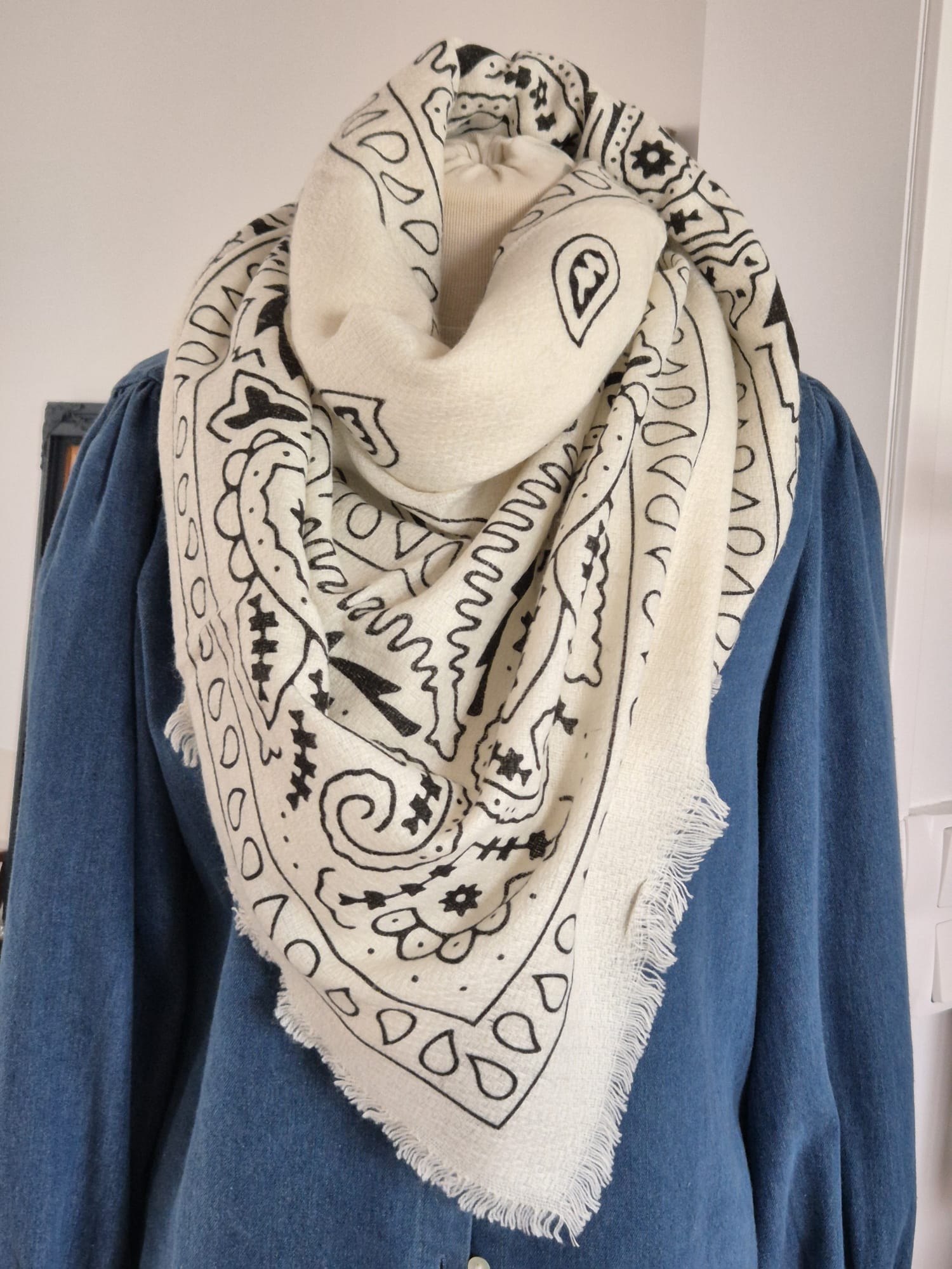 Grand Foulard carré Maxime de couleur blanc avec motifs noirs . Impression sur 1 face
