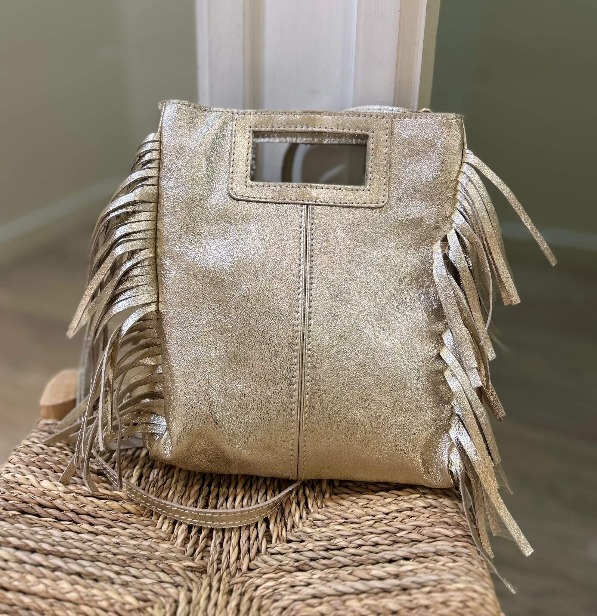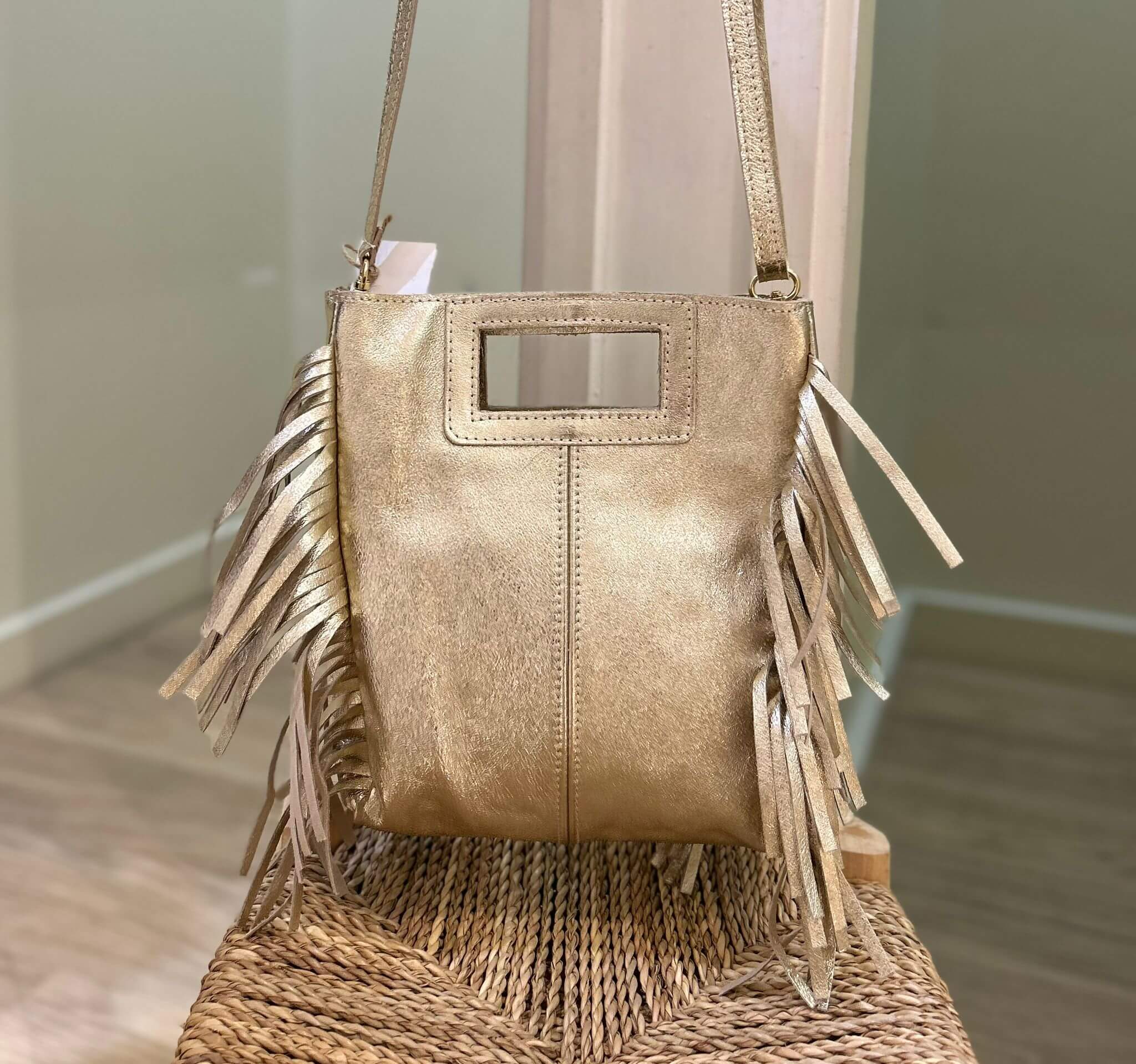 Sac à main Marcel en cuir suédé avec franges . Couleur OR