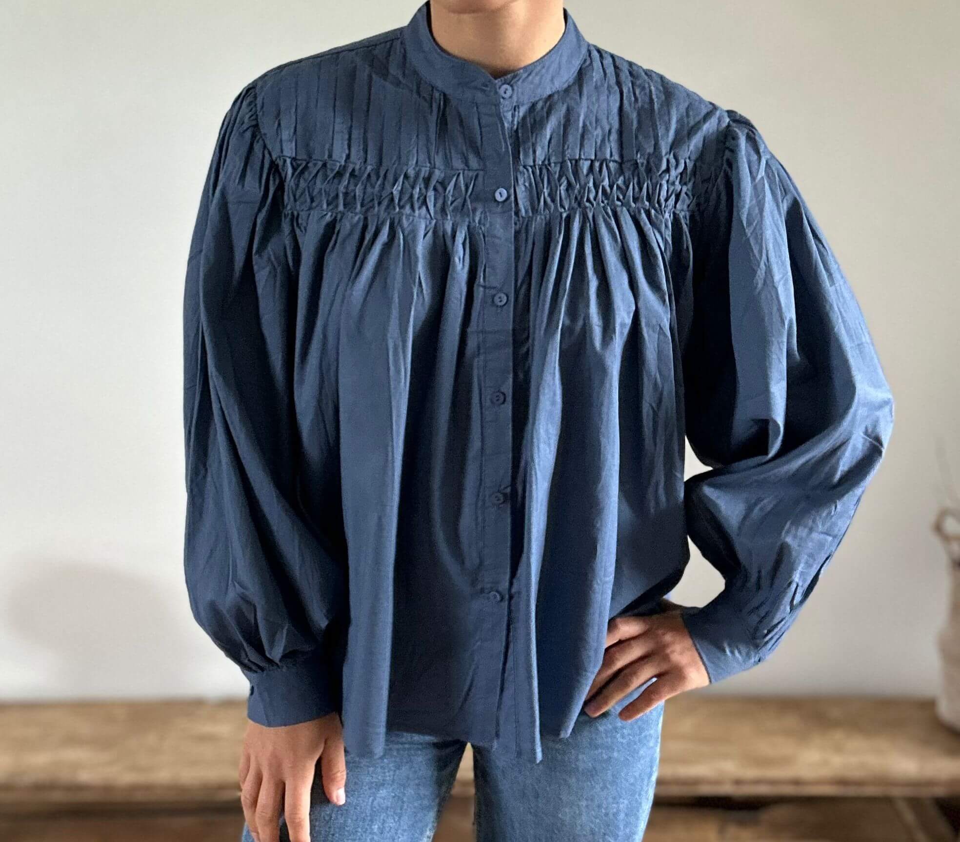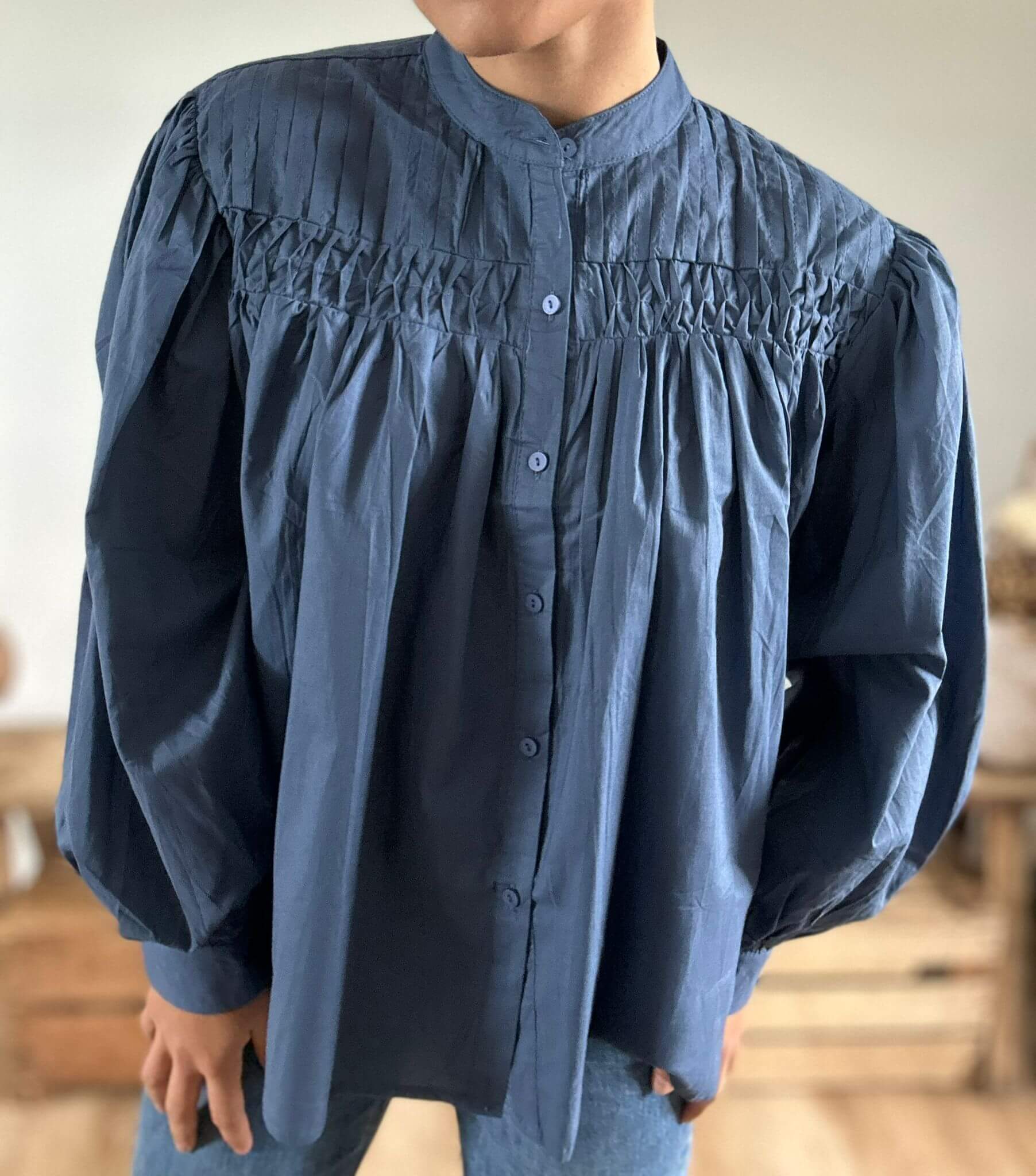 Chemise bleue Colette avec fronçage devant. Manches bouffantes assez amples. Taille généreusement