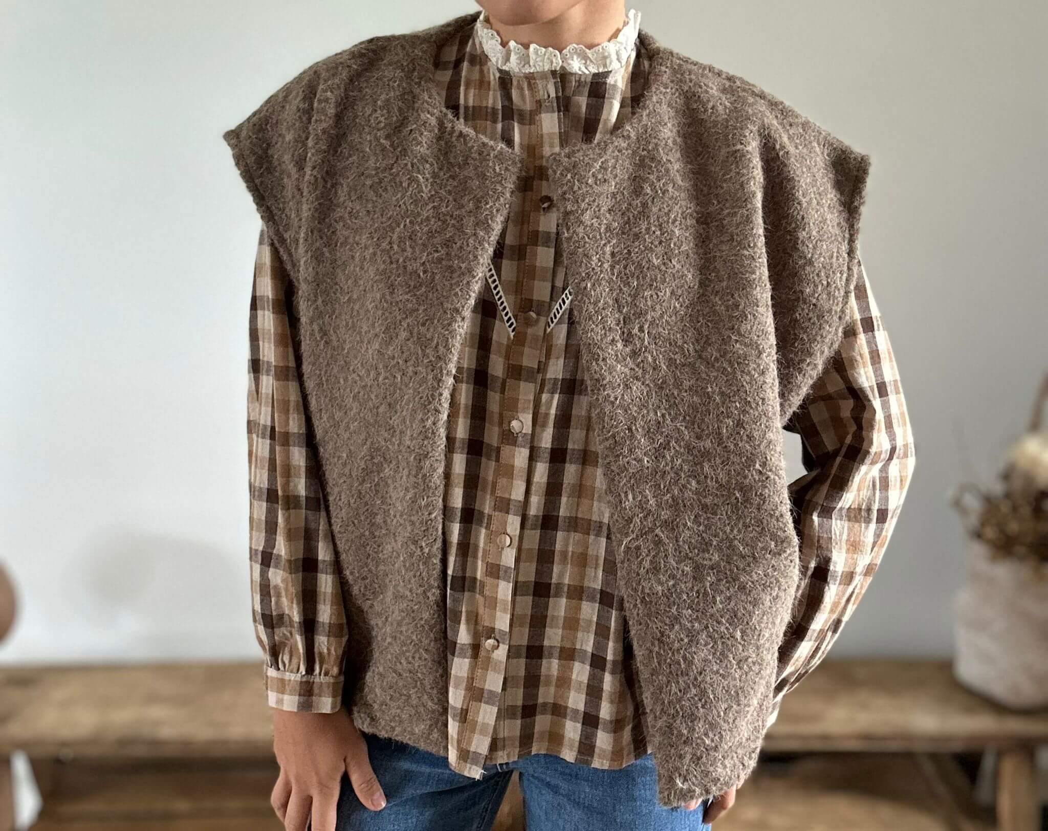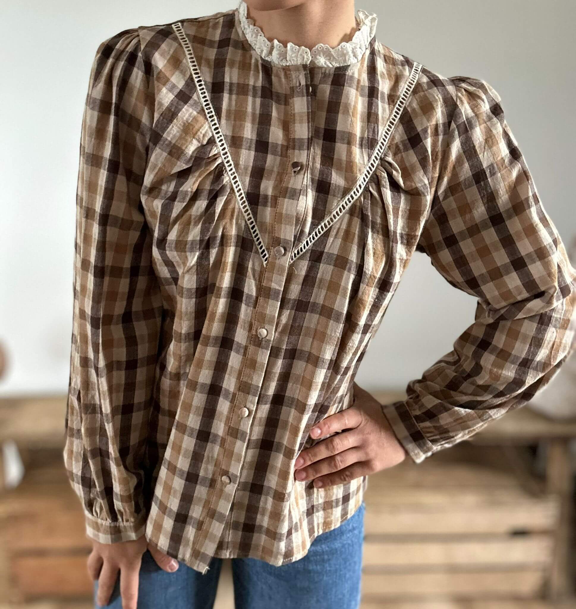 Chemise à carreaux Léonie (tonalités de beige et de marron) avec un petit col en dentelle .
