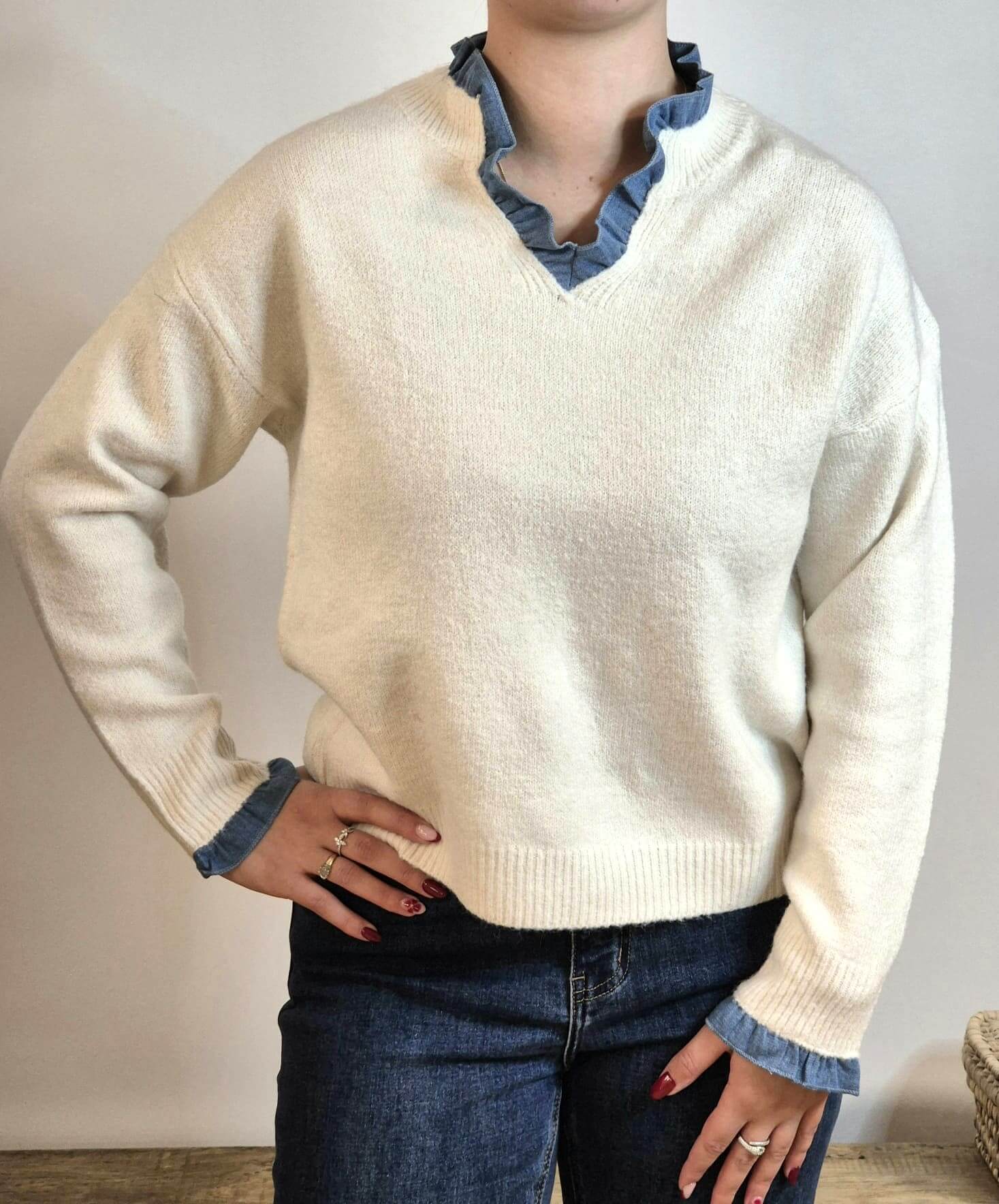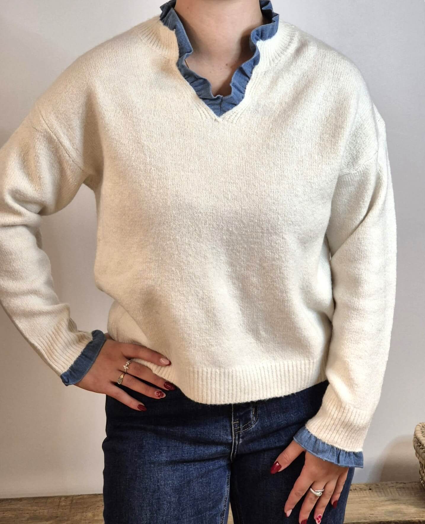 Pull Sarah blanc cassé avec encolure et poignées en jean. Taille unique soit (36 au42 maximum)