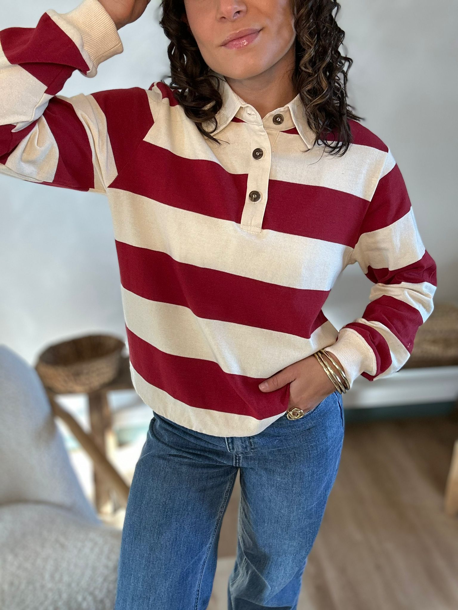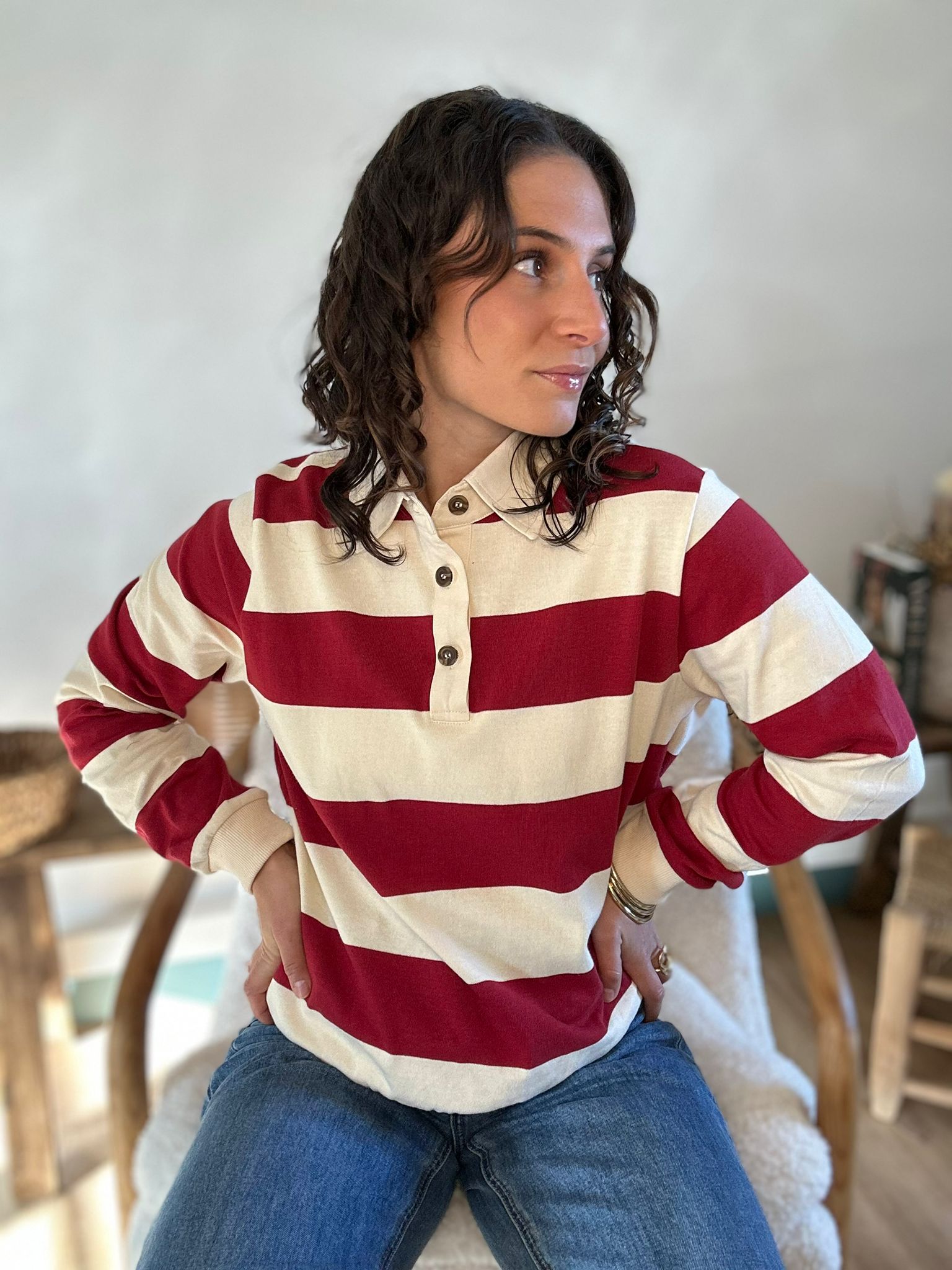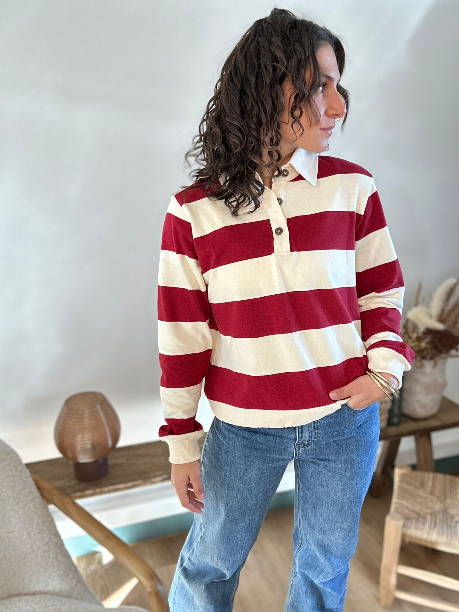 Pull Zia façon polo de rugby rouge foncé et beige