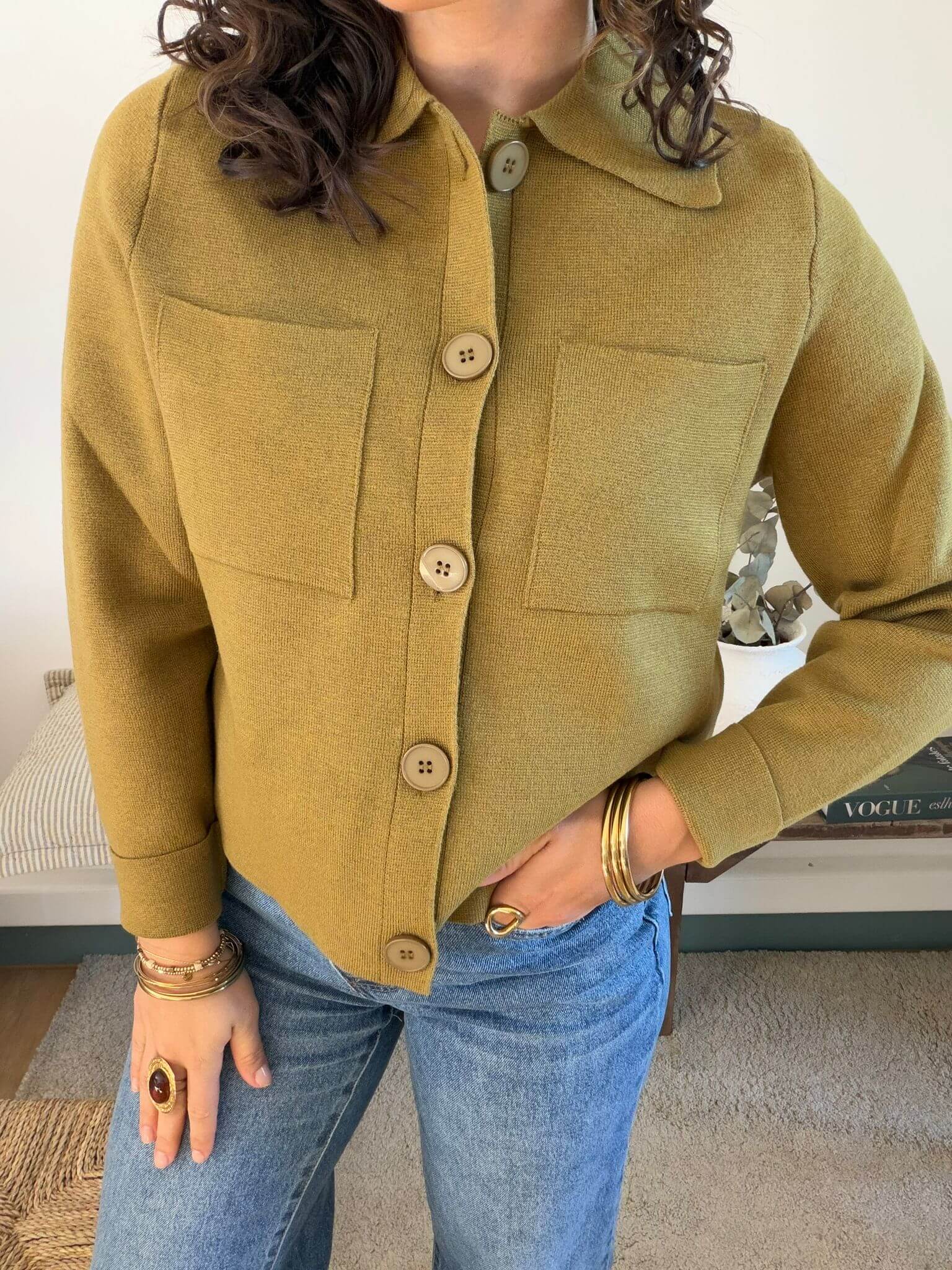 Adoptez un style à la fois chic et décontracté avec ce gilet en maille douce, au coloris vert olive intemporel. Sa coupe droite légèrement structurée met en valeur la silhouette tout en offrant un confort optimal au quotidien.