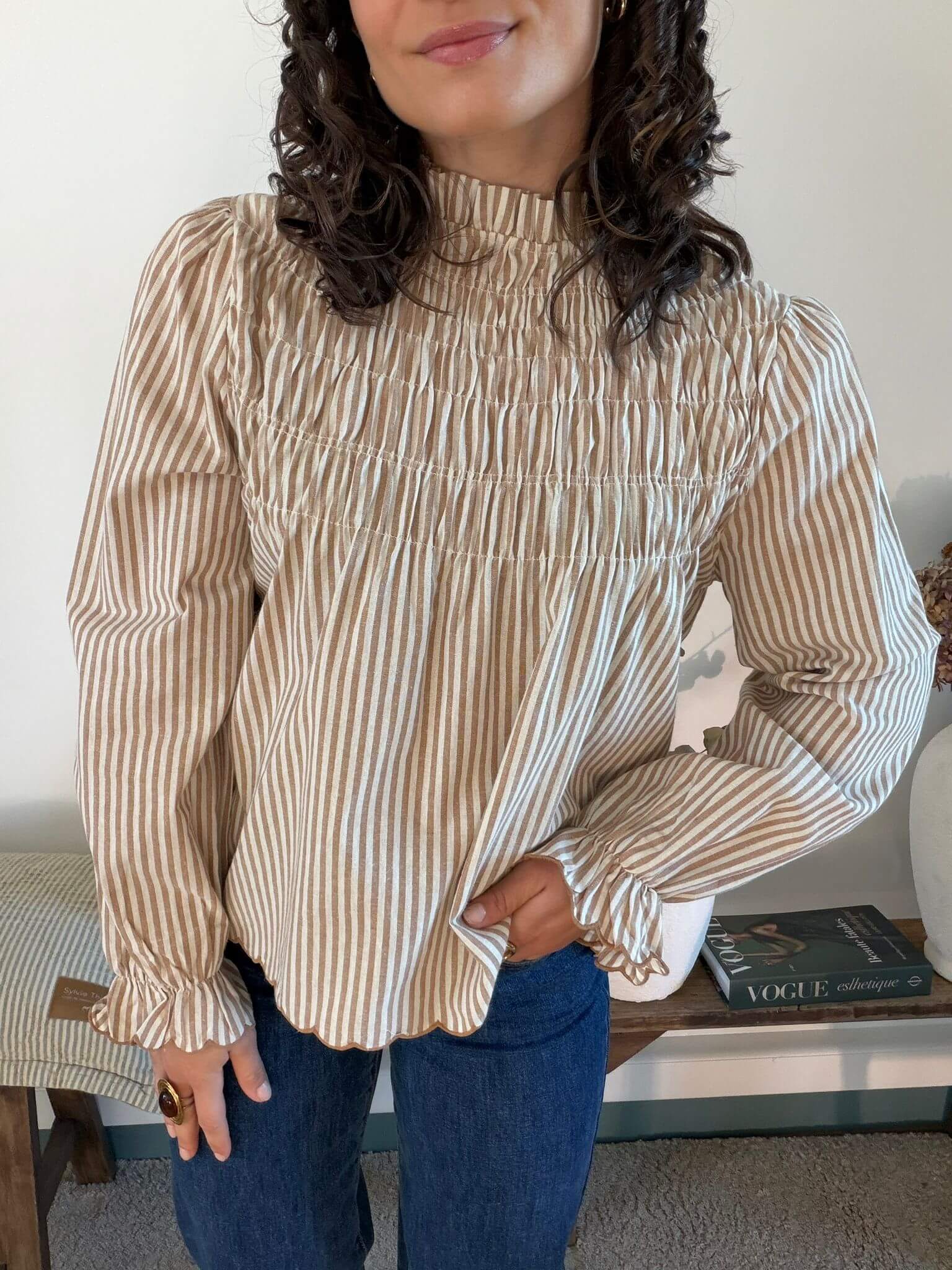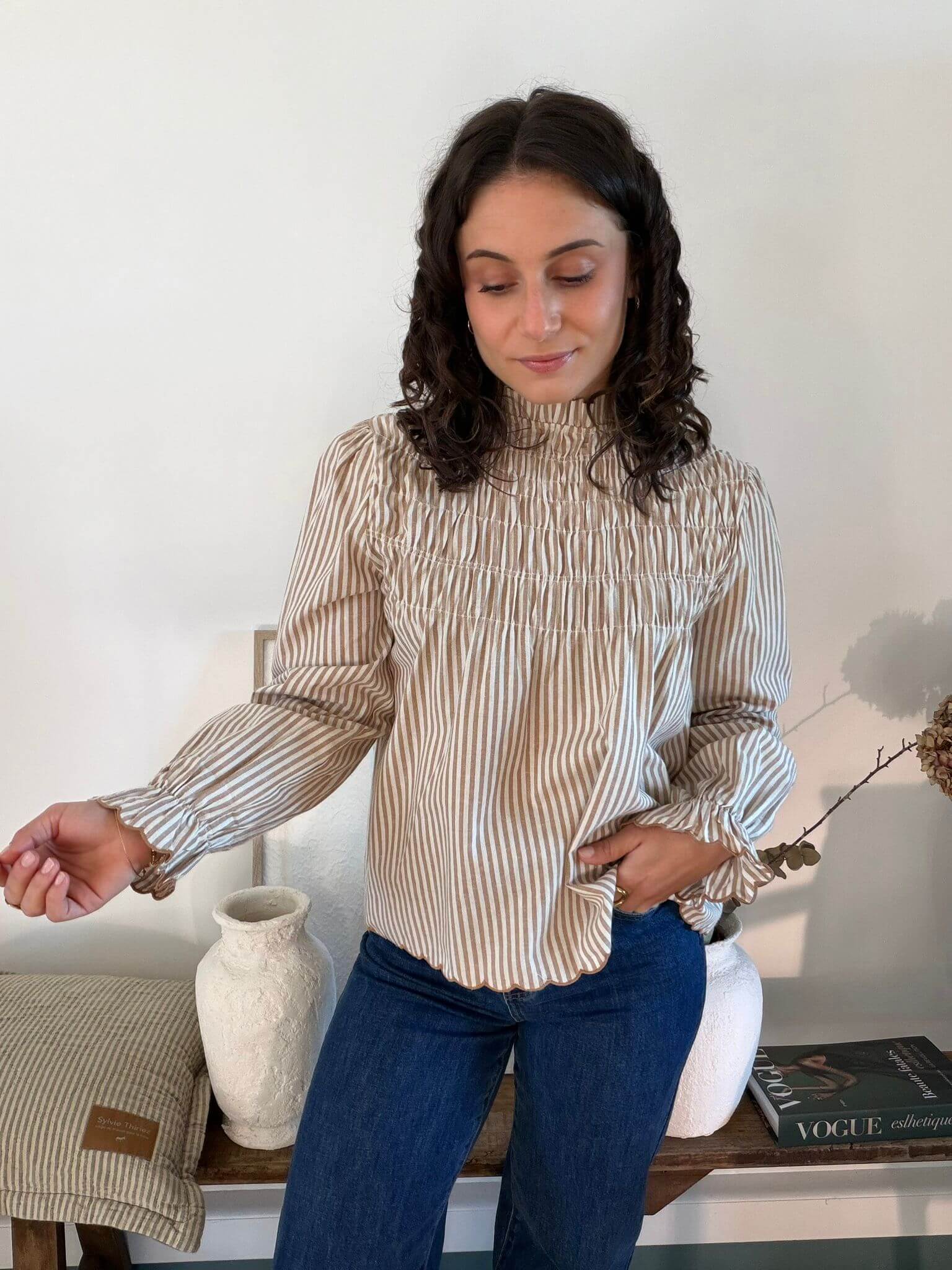 Blouse rayée marron et beige col montant smocké Léopoldine