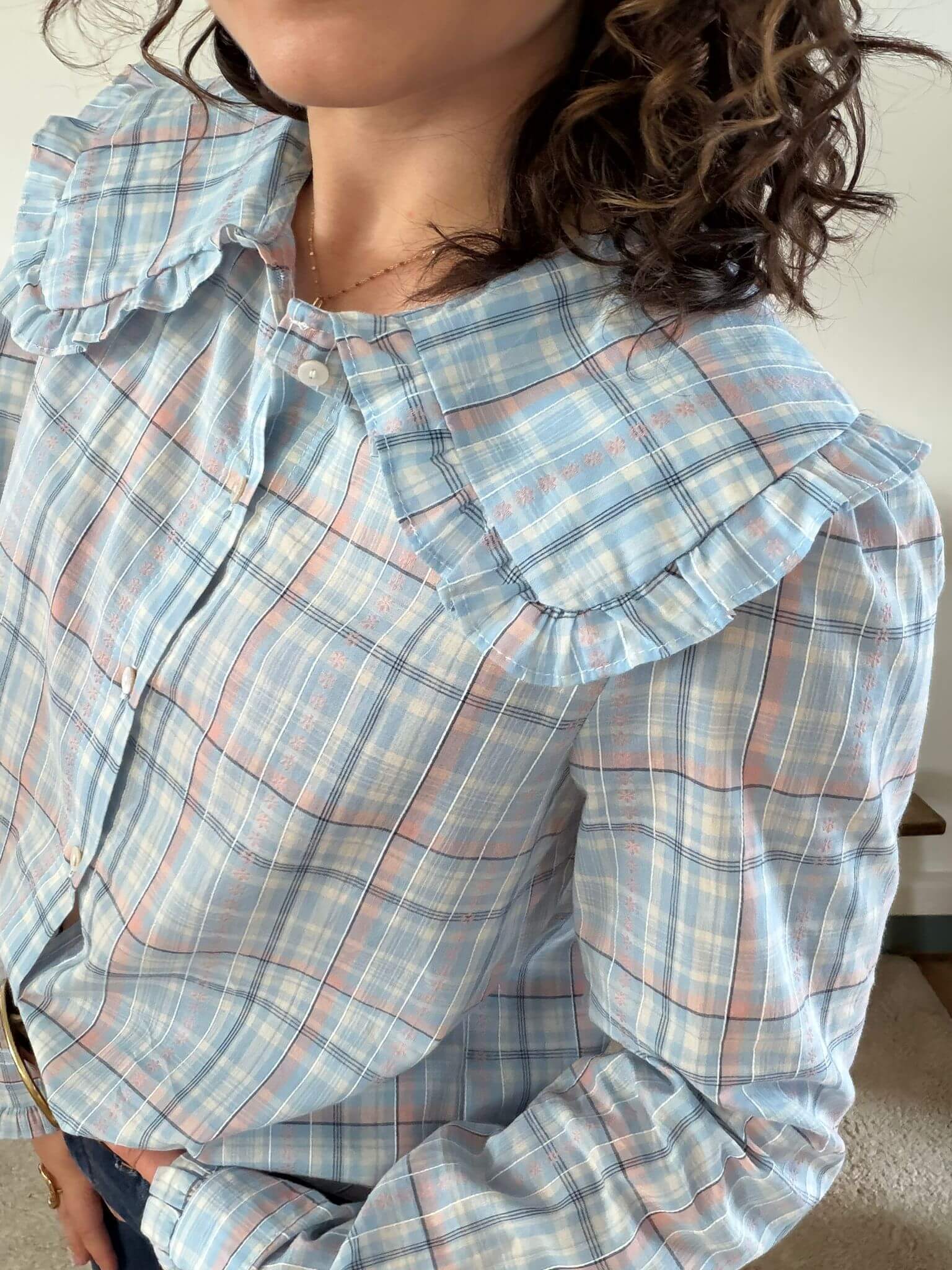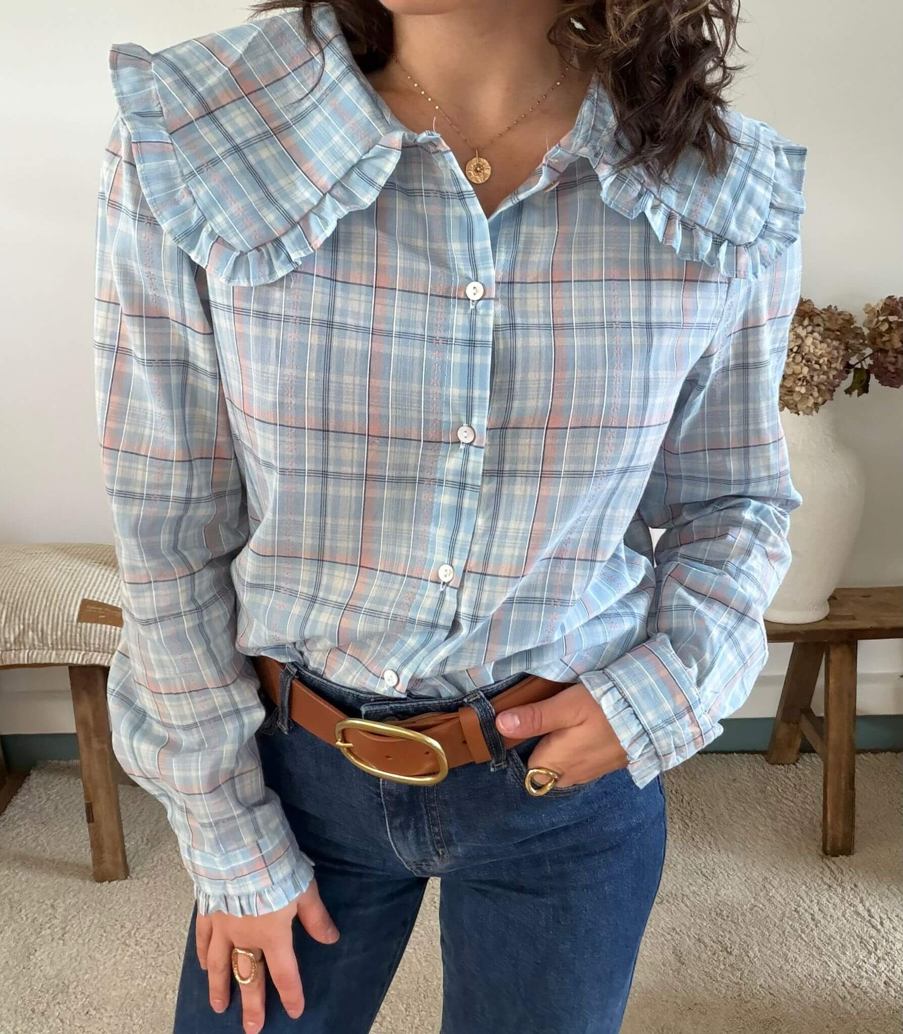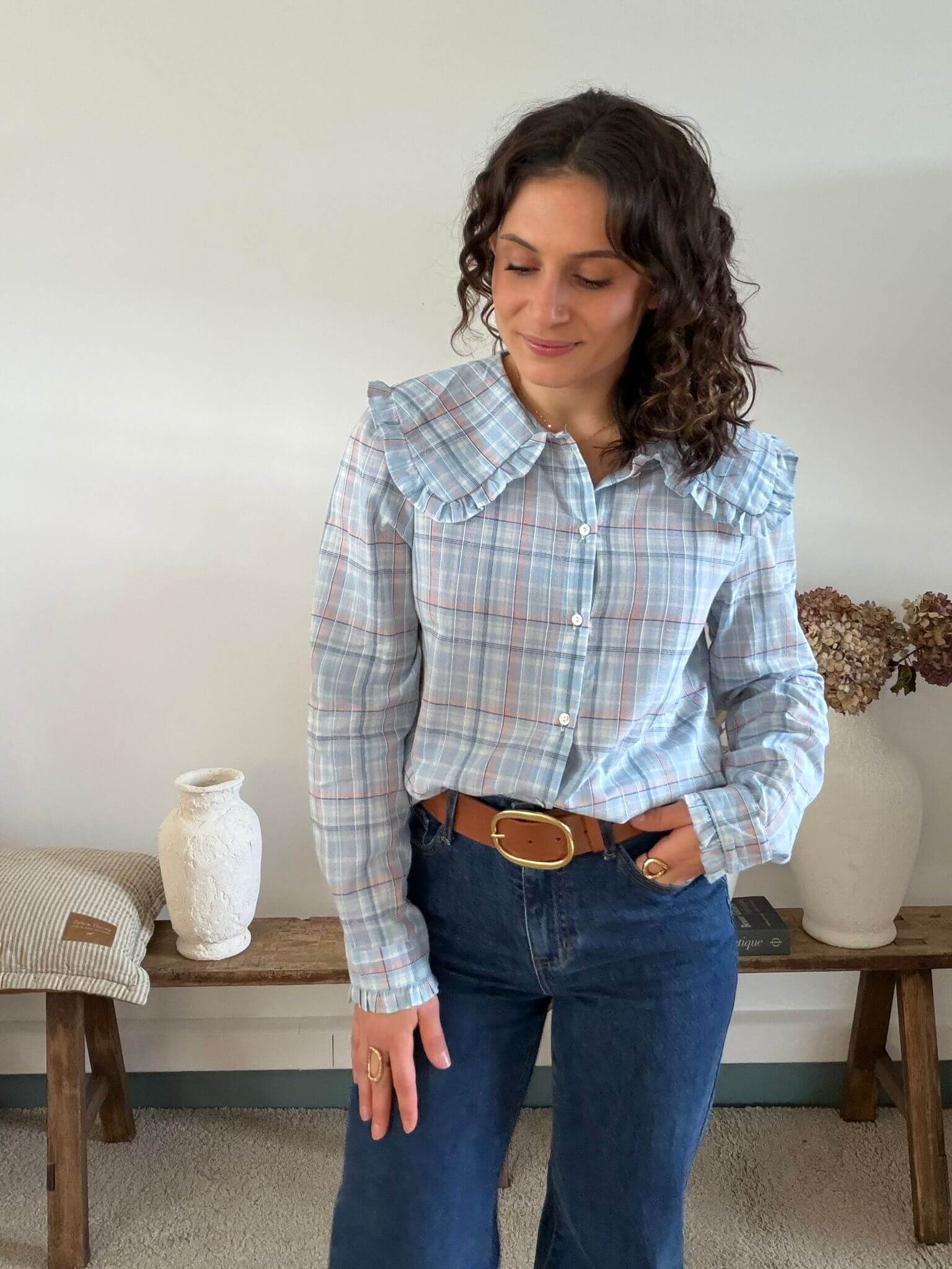 Cette chemise femme à carreaux bleus séduit par son style à la fois romantique et intemporel. Confectionnée dans un coton léger et agréable à porter, elle offre un confort optimal tout au long de la journée. Son motif à carreaux délicats dans des tons de bleu et de rose apporte douceur et fraîcheur à la silhouette. Son véritable atout réside dans son col large volanté, subtilement froncé, qui donne à cette chemise un esprit rétro chic très tendance. Dotée d’une coupe droite, de manches longues et de poignets délicatement froncés, elle se porte aussi bien avec un jean qu’avec un pantalon taille haute pour un look bohème et élégant. Idéale pour la mi-saison, cette chemise à carreaux pour femme est parfaite pour celles qui recherchent une pièce féminine, confortable et facile à assortir.