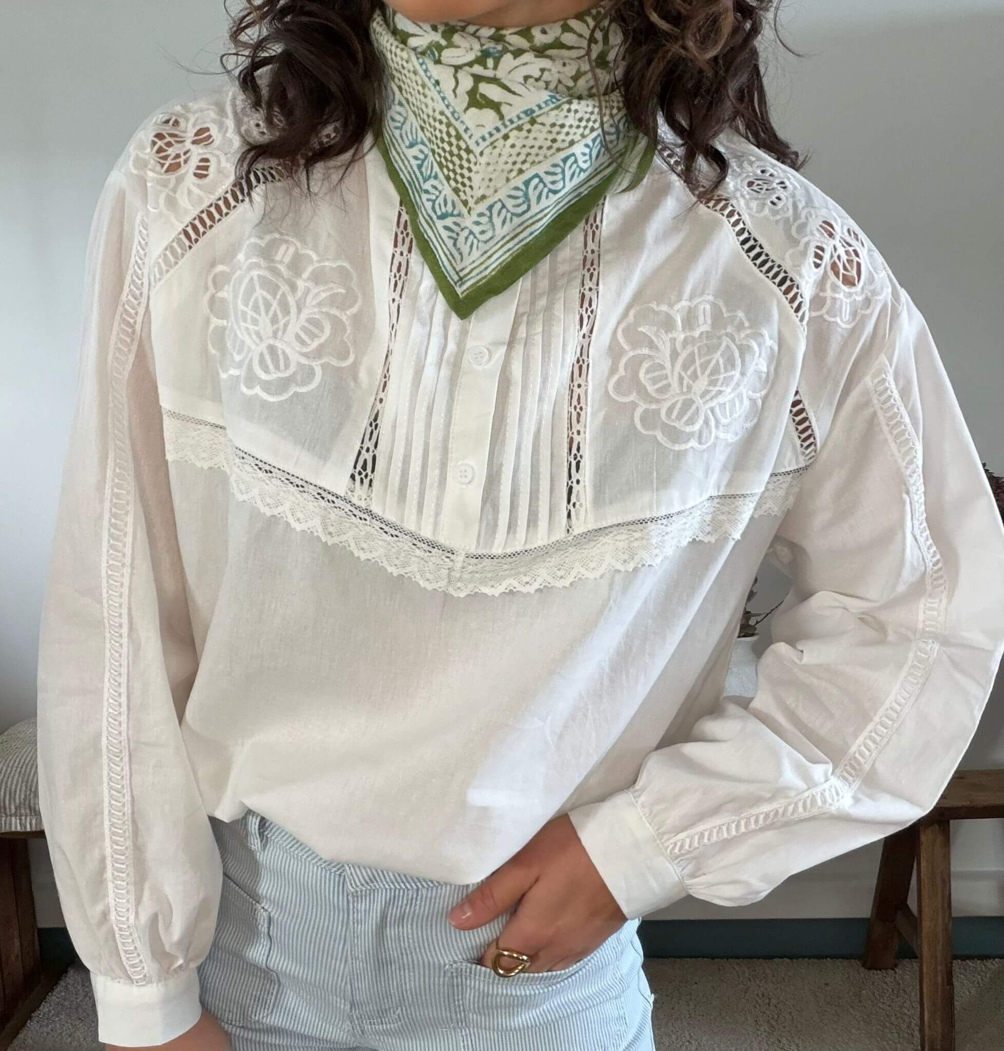 Cette blouse en coton léger séduit par son charme délicatement bohème et ses finitions raffinées. Confectionnée dans une matière douce et légèrement transparente, elle est sublimée par de broderies florales placées sur le devant et les épaules, ainsi que par de subtiles incrustations de dentelle qui structurent la silhouette.