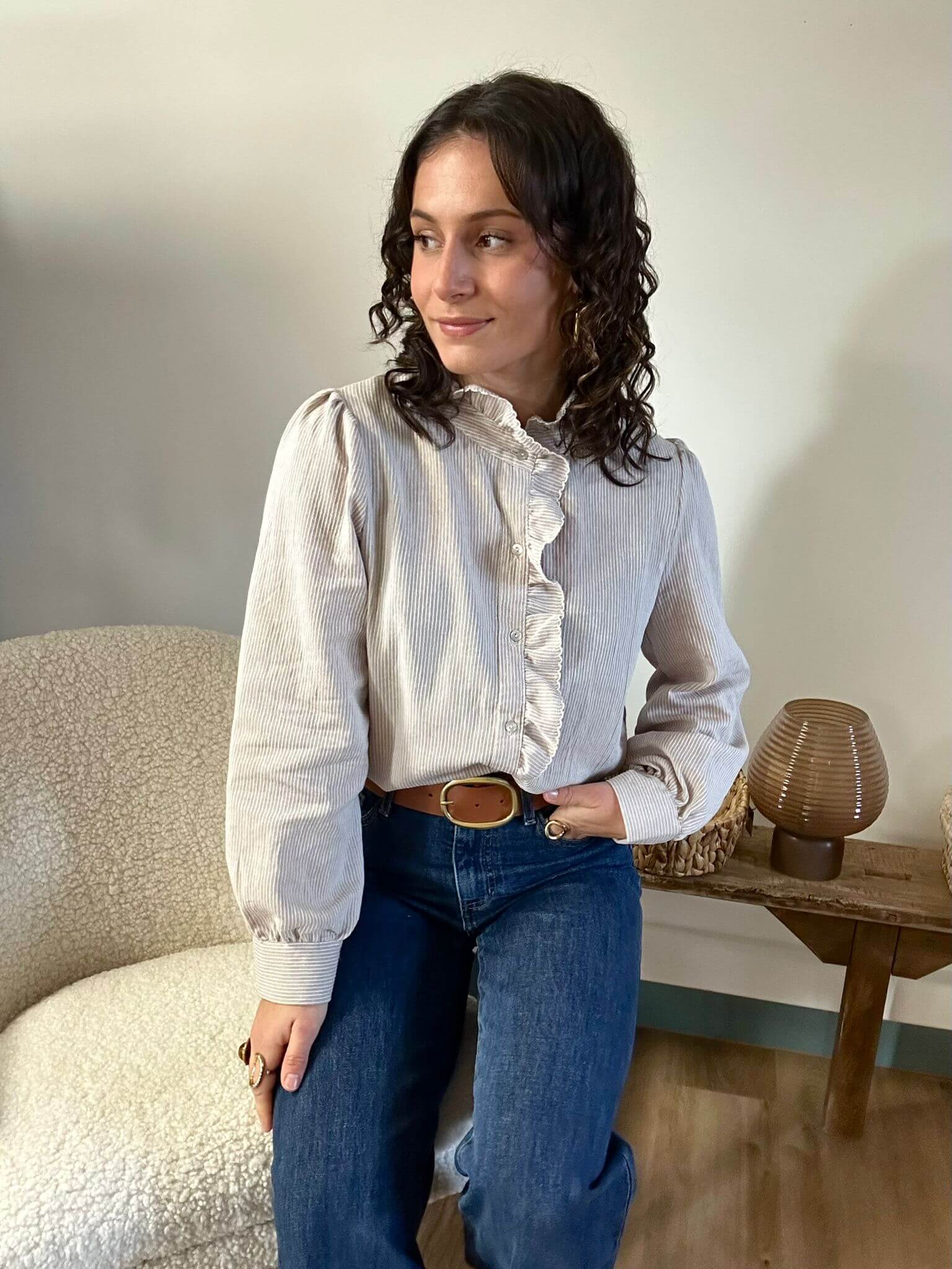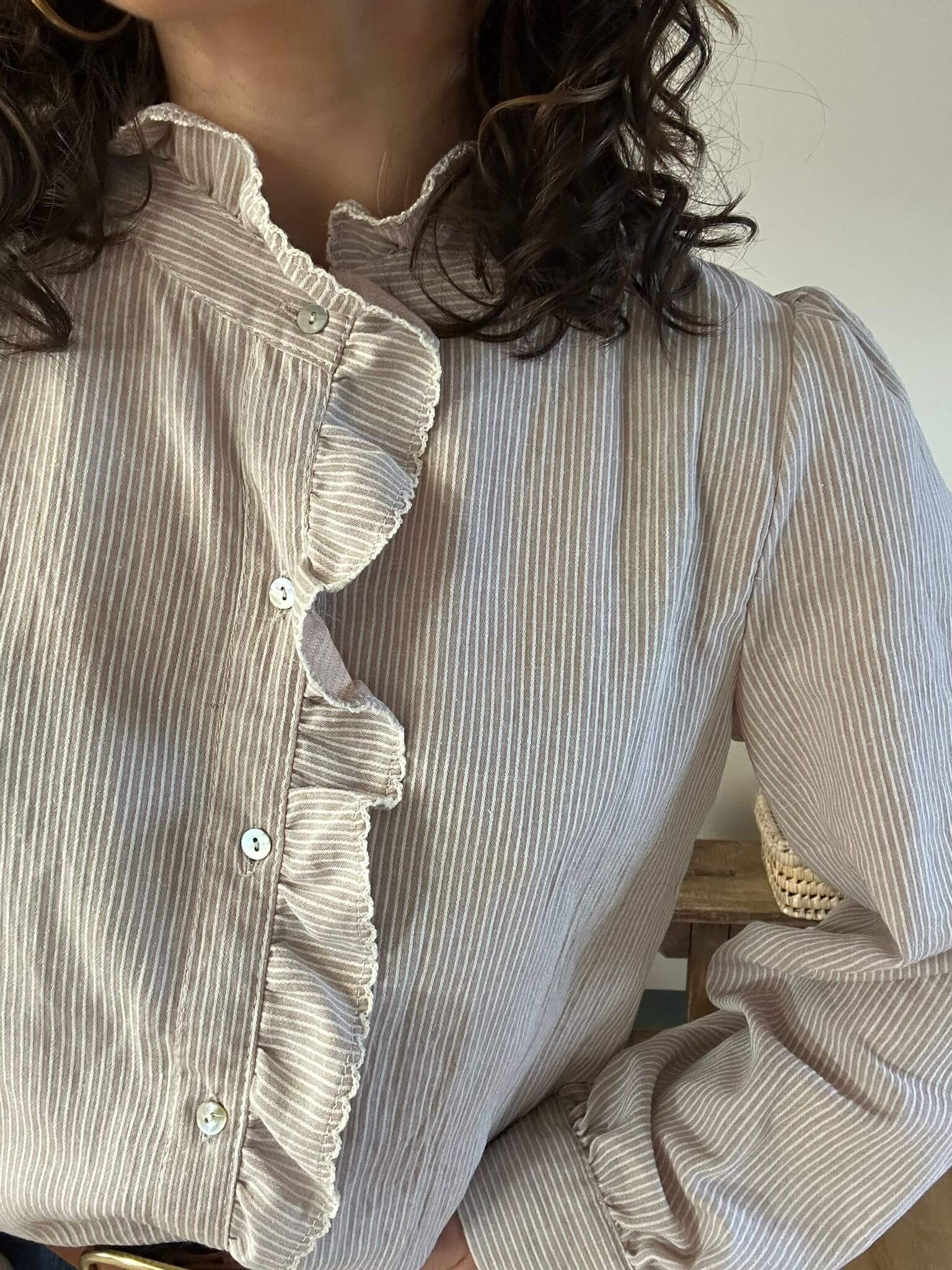 Chemise Lucette fluide et légère beige et blanc à rayures très fines.