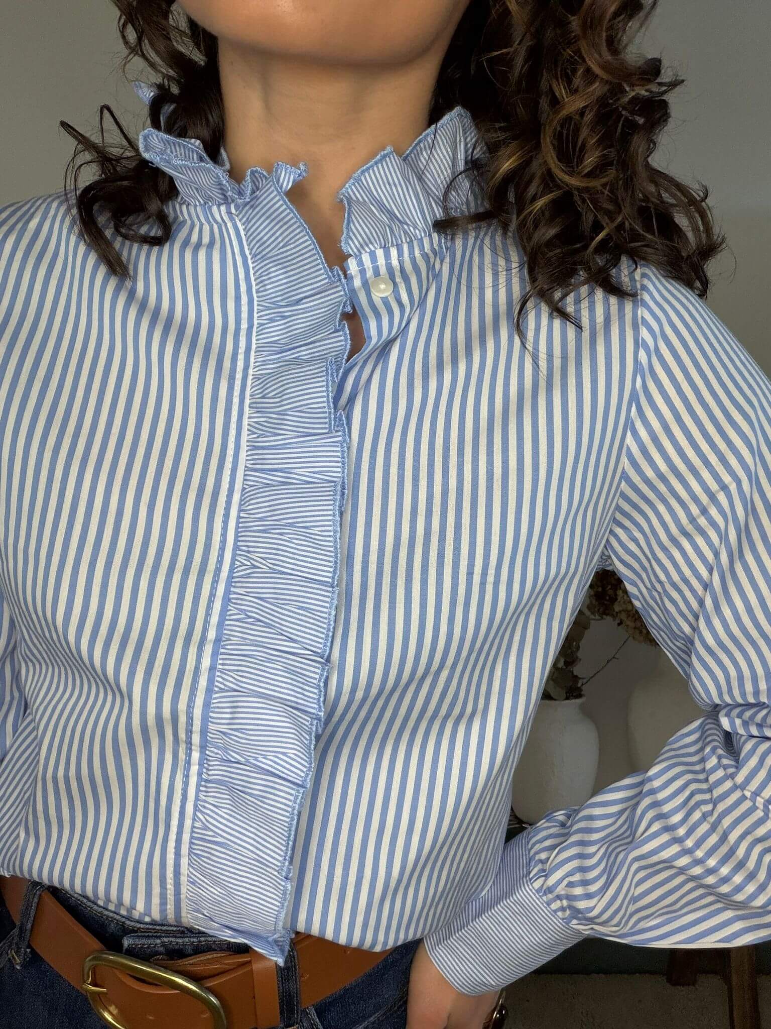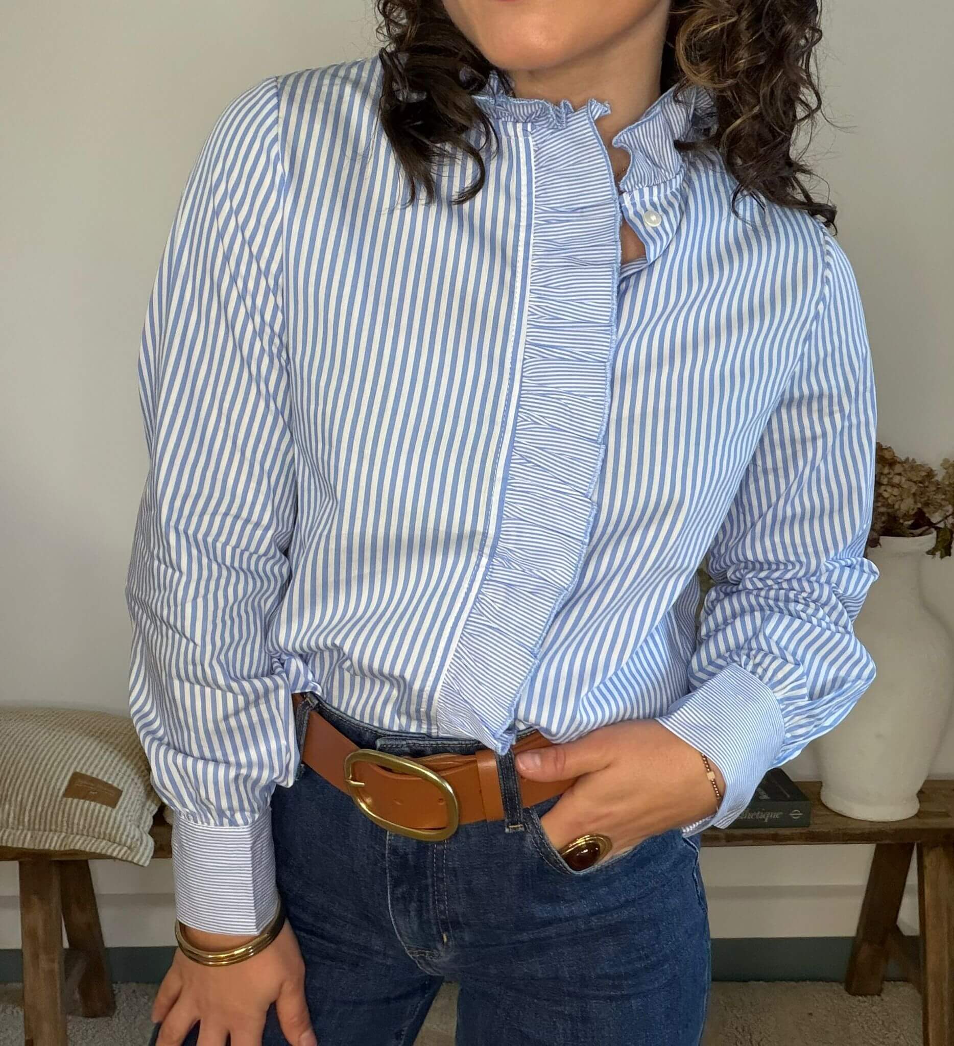 Intemporelle et féminine, cette chemise rayée bleu et blanc revisite le classique du vestiaire avec une touche de modernité. Confectionnée dans un coton doux et confortable, elle se distingue par son plastron à volants délicatement froncé et son col montant subtilement volanté, apportant du caractère à la silhouette.