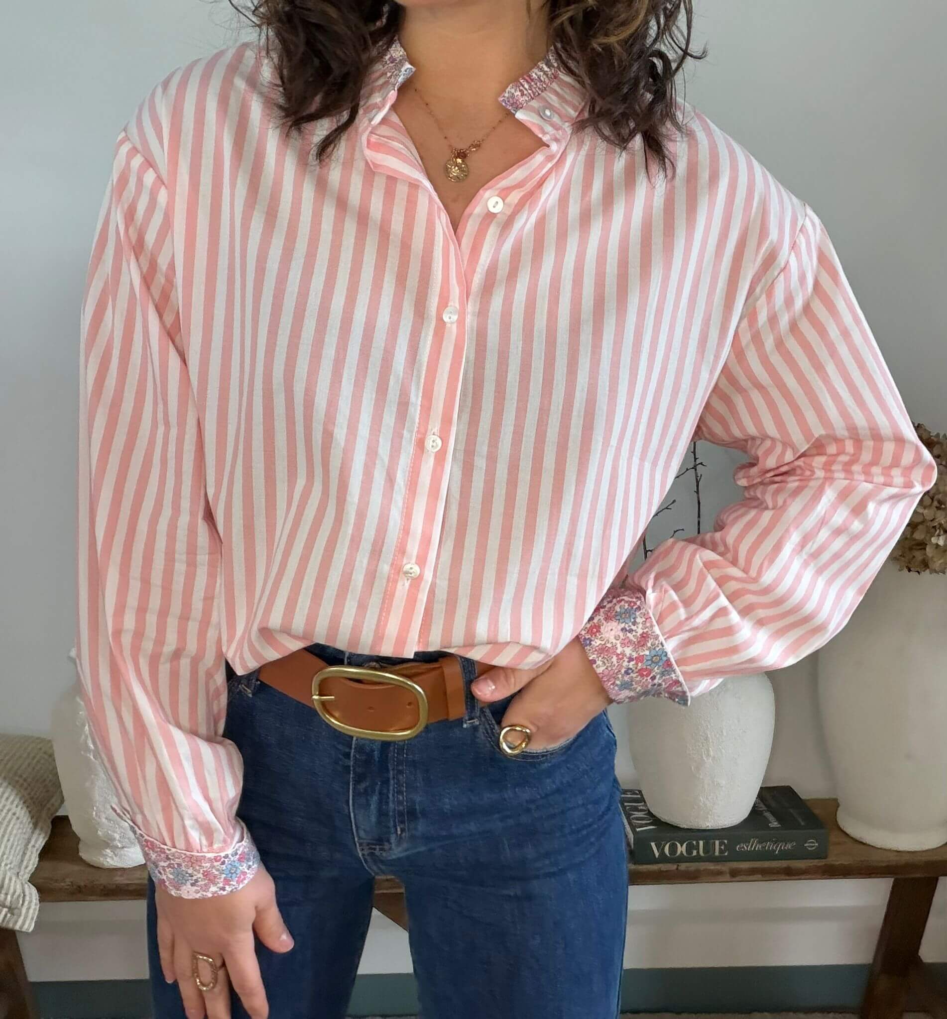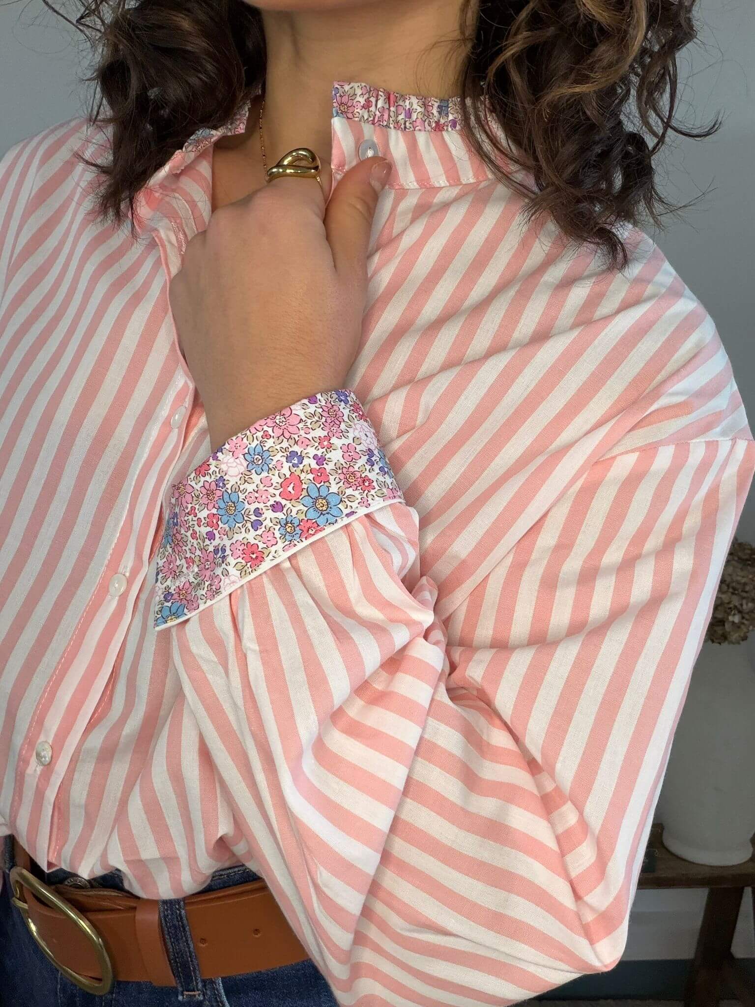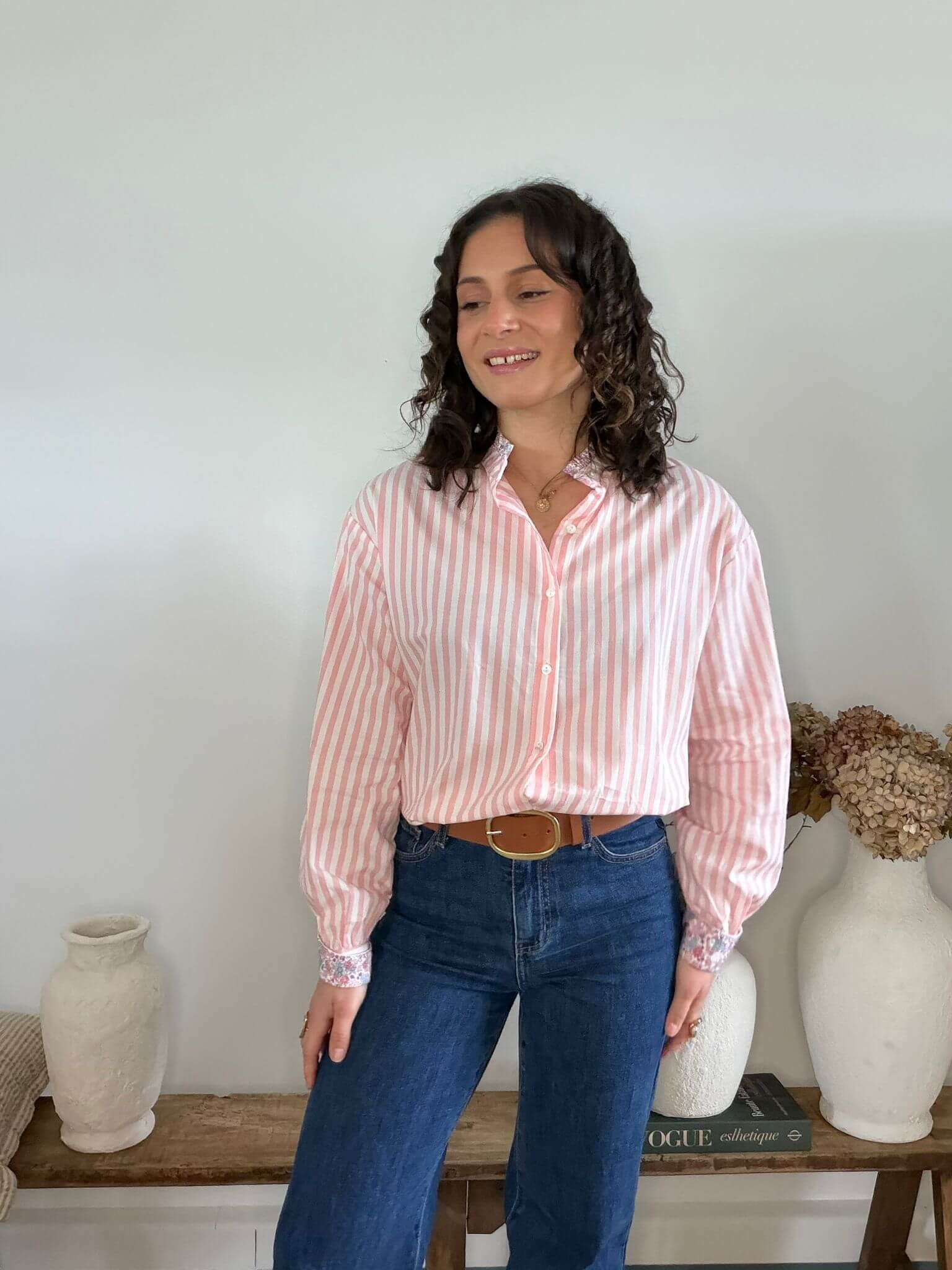 Féminine et lumineuse, cette chemise rayée rose et blanc apporte une touche de fraîcheur au vestiaire du quotidien. Confectionnée dans une matière légère et agréable à porter, elle séduit par ses rayures verticales qui allongent la silhouette et par ses finitions contrastées en tissu fleuri liberty à l’intérieur du col et des poignets. Sa coupe droite, son col classique et sa patte de boutonnage discrète en font une pièce facile à associer, aussi bien avec un jean qu’avec un pantalon plus habillé. Les détails floraux ajoutent une note subtilement bohème et raffinée. Une chemise chic et intemporelle, idéale pour un look élégant au quotidien.