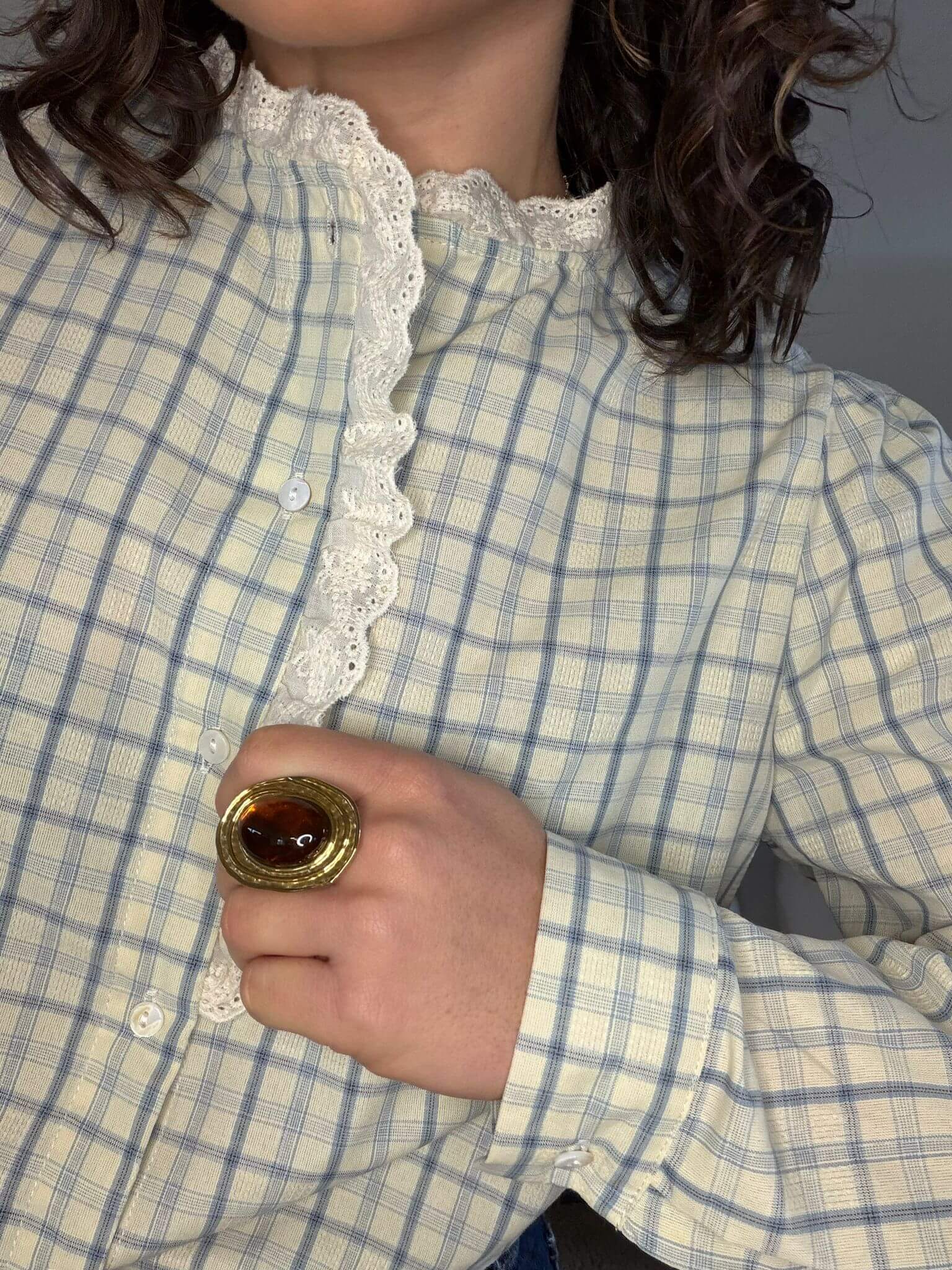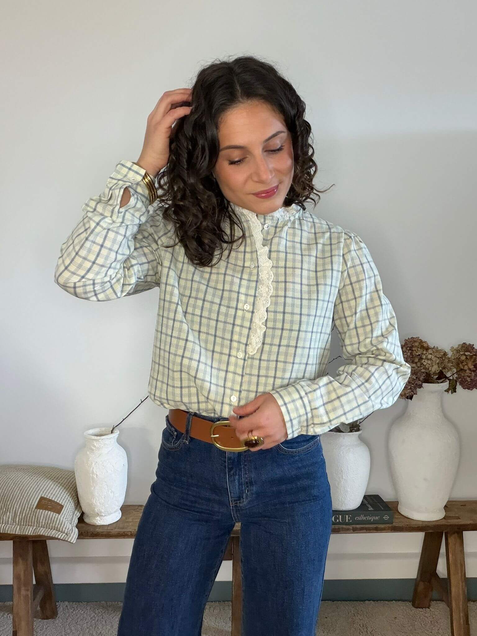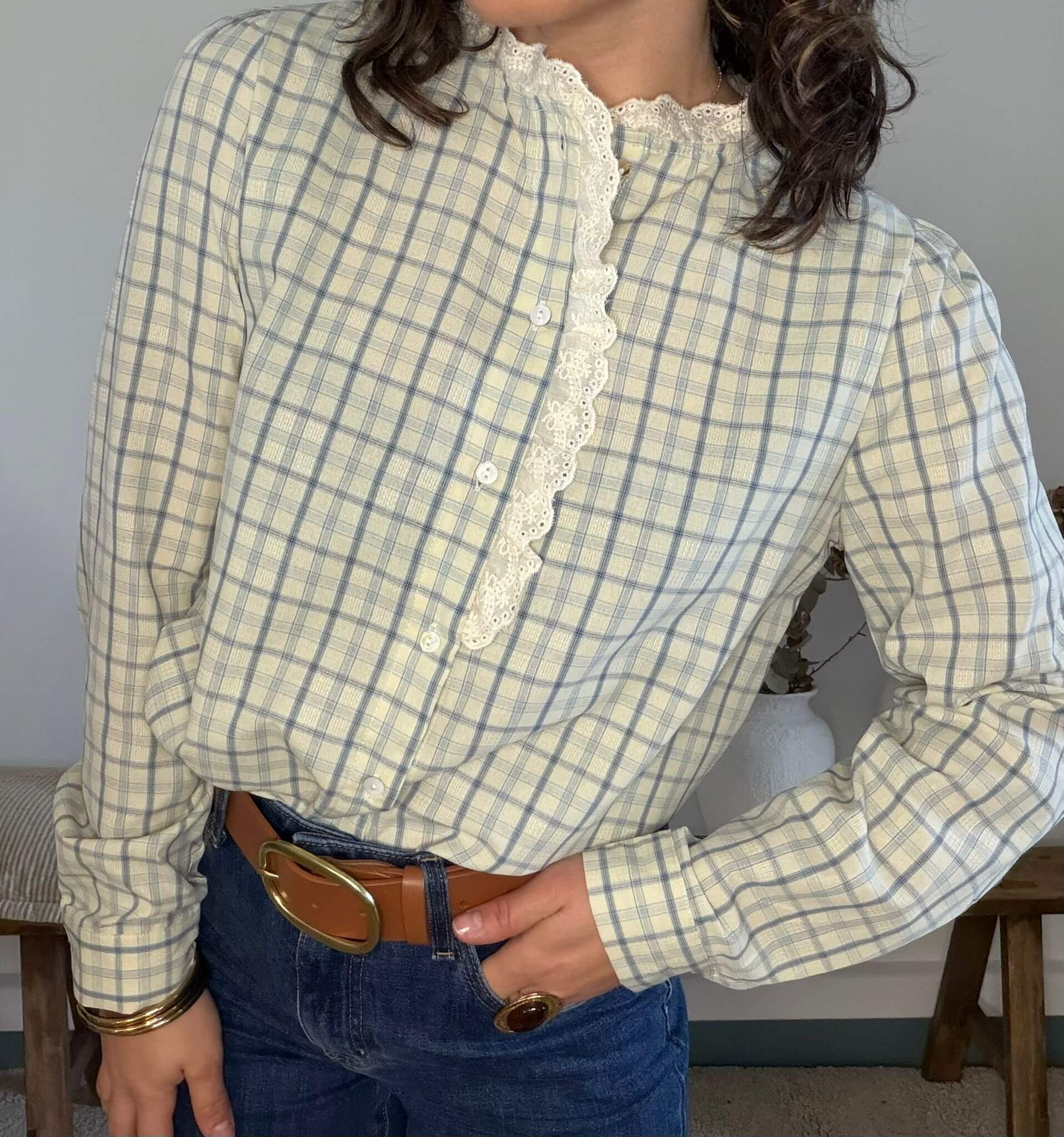 Blouse à carreaux Sixtine écru et bleu avec dentelle