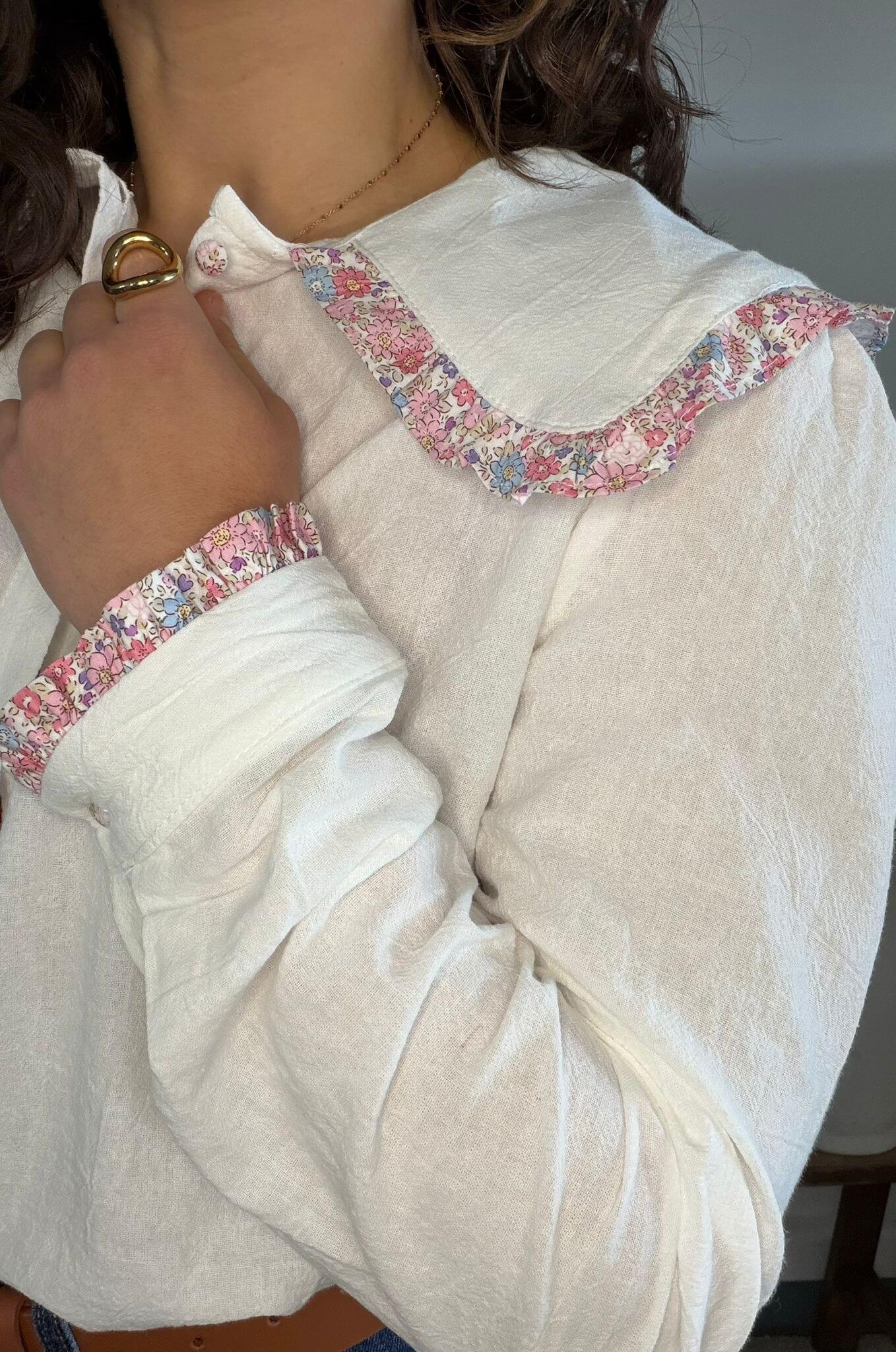 Chemise Zéline couleur blanc avec col Claudine en liberty rose. Boutons liberty également - Le modèle porte du S et mesure 1.60
