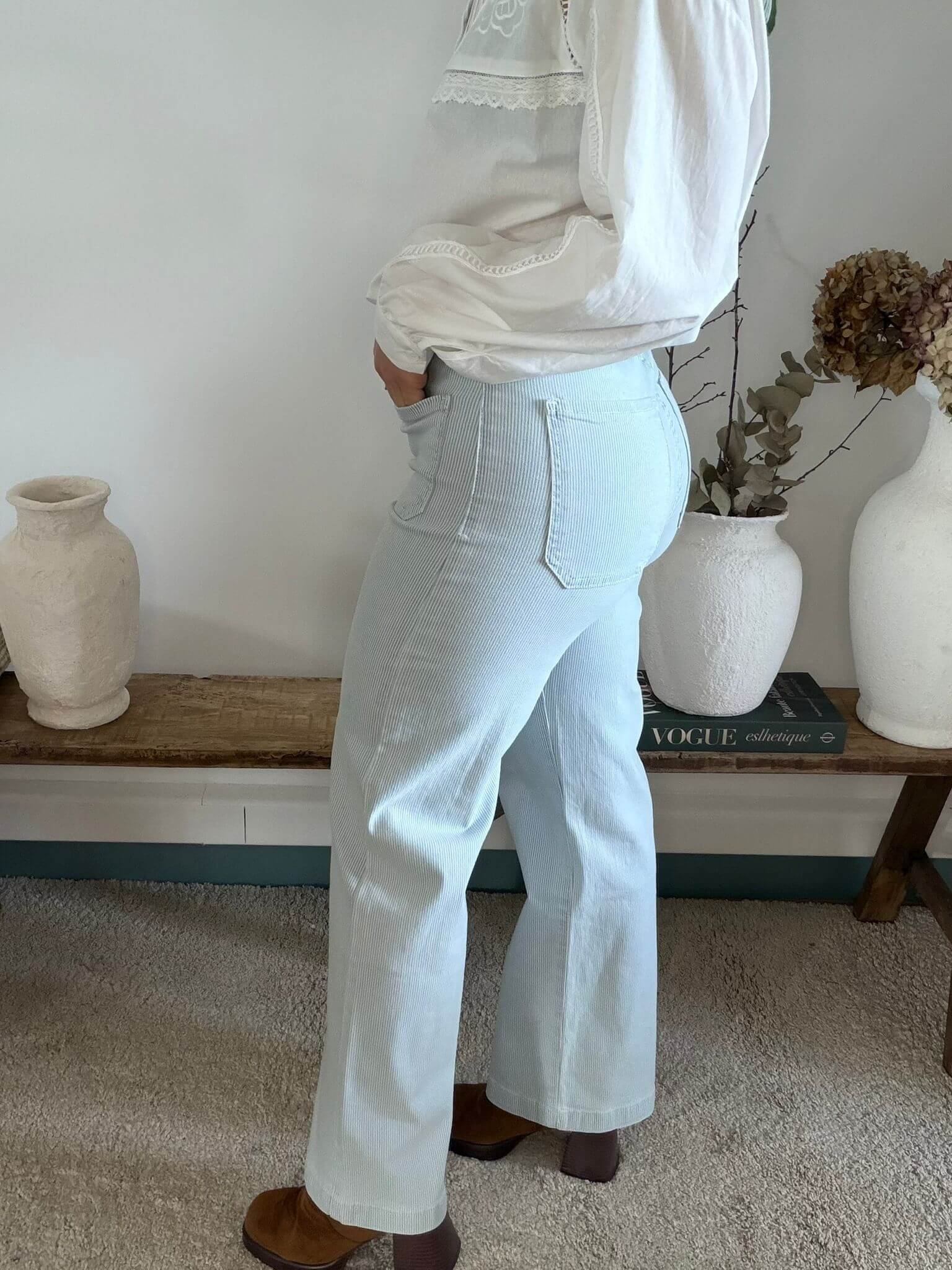 Ce pantalon femme en bleu clair et blanc à rayures est une pièce incontournable du dressing casual chic. Confectionné dans une matière douce et confortable., il séduit par son élégance tout en restant agréable à porter au quotidien. Sa coupe droite légèrement évasée, sa taille mi-haute et ses poches plaquées sur le devant structurent la silhouette et offrent un style à la fois moderne et intemporel. Facile à associer, ce pantalon se porte aussi bien avec une blouse romantique qu’avec un pull ou une chemise pour un look chic et décontracté.